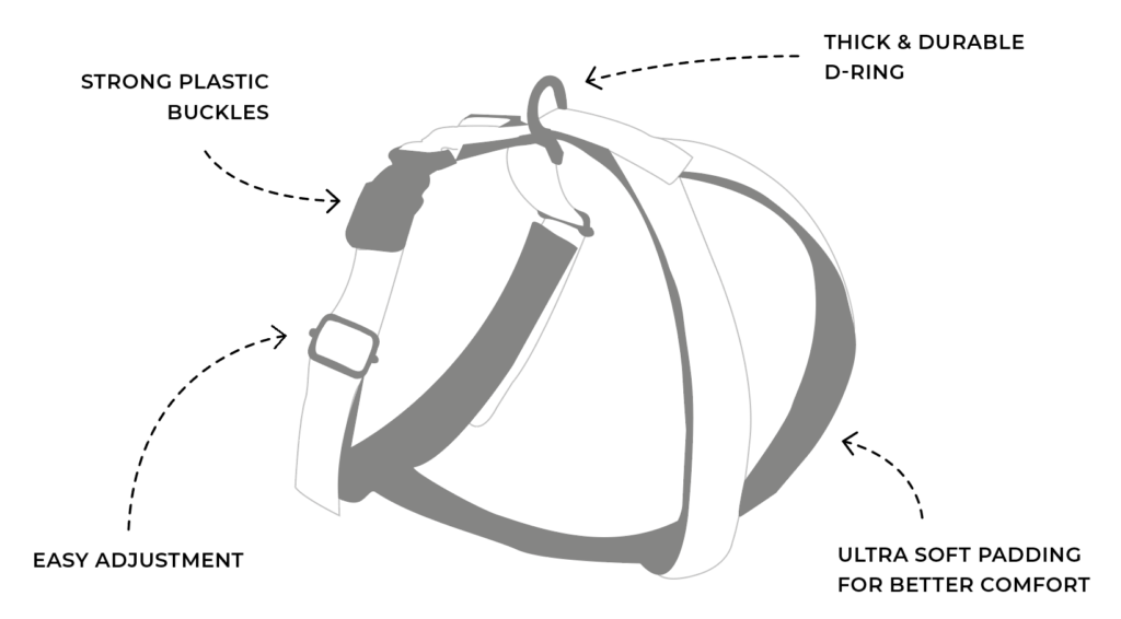 Due to its ergonomic design, the Grand Soft harness fits comfortably on the dog’s body without constricting it. There is an additional soft lining on the inside of the tape, which brings even more comfort to the dog. The harness evenly distributes the weight during everyday activities and does not overload the spine. They are adjustable at the back, making them easy to fit to your dog.