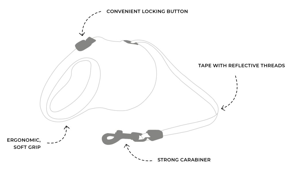 The automatic leash provides immediate length adjustment. The leash is made from durable reflective tape, 3-5 meters long, and allows your pet to move freely during everyday activities. The intuitive start/stop system makes it possible to safely stop the dog in any situation, giving the owner the comfort of full control.