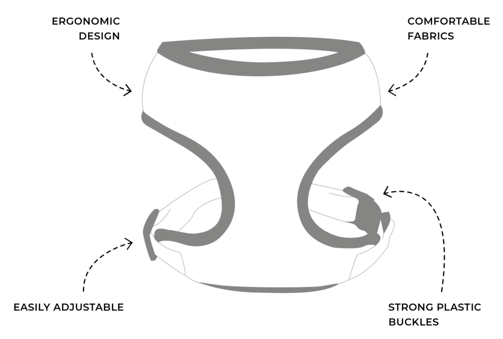 The Scout no-pull harness is perfect for active dogs. Due to its ergonomic design, it fits well and distributes the weight evenly during everyday activities. The shoulder straps are adjustable on the back loop, making it easy to fit to your dog. When choosing the size, make sure that it can be easily moved over the pet’s head.